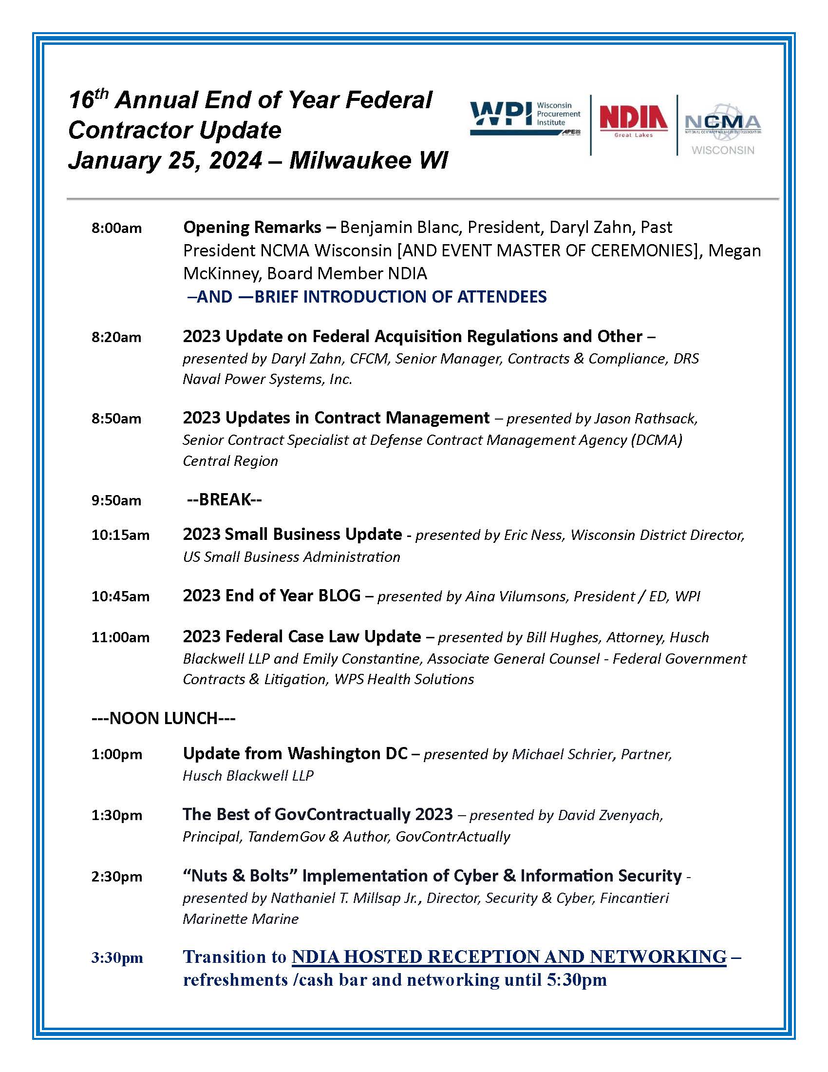 Join Wisconsin’s Federal contractors and subcontractors for this annual event. Briefings during the event will provide an overview of the current Federal contracting environment as well as highlight up and coming trends for future business opportunities. Click to download AGENDA EOY Federal Contractor Update Jan 25 2024 WPI NCMA NDIA.