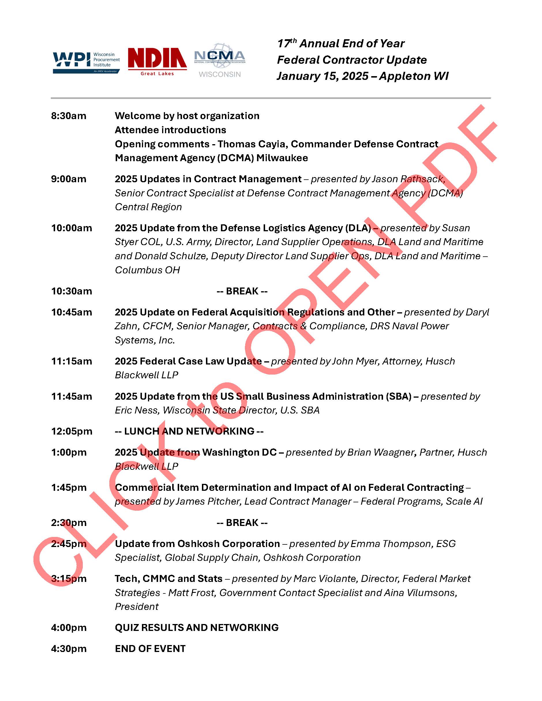 Join Wisconsin’s Federal contractors and subcontractors for this annual event. Briefings during the event will provide an overview of the current Federal contracting environment as well as highlight up and coming trends for future business opportunities.