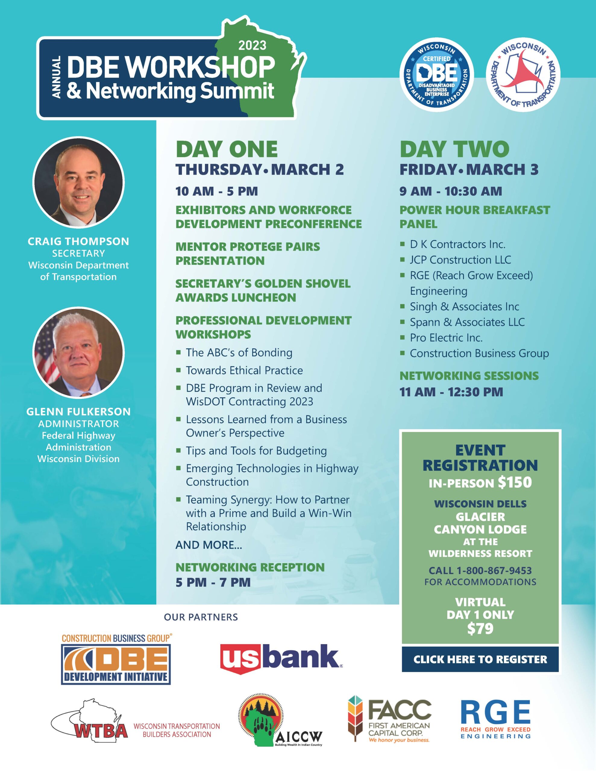 The Wisconsin Department of Transportation (WisDOT) hosts the Annual Disadvantaged Business Enterprise (DBE) Workshop and Networking Summit to engage highway contractors, consultants, subcontractors and laborers in effective communications and teambuilding interactions that lead to a diverse and equitable highway contracting environment. To view the full agenda for this event, click here.