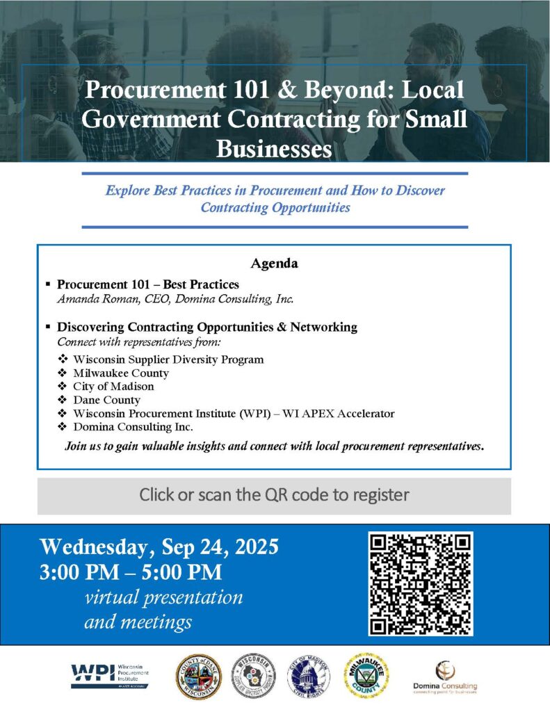 Explore best practices in procurement and how to discover local government contracting opportunities. Click on the flyer below to download and to complete registration.