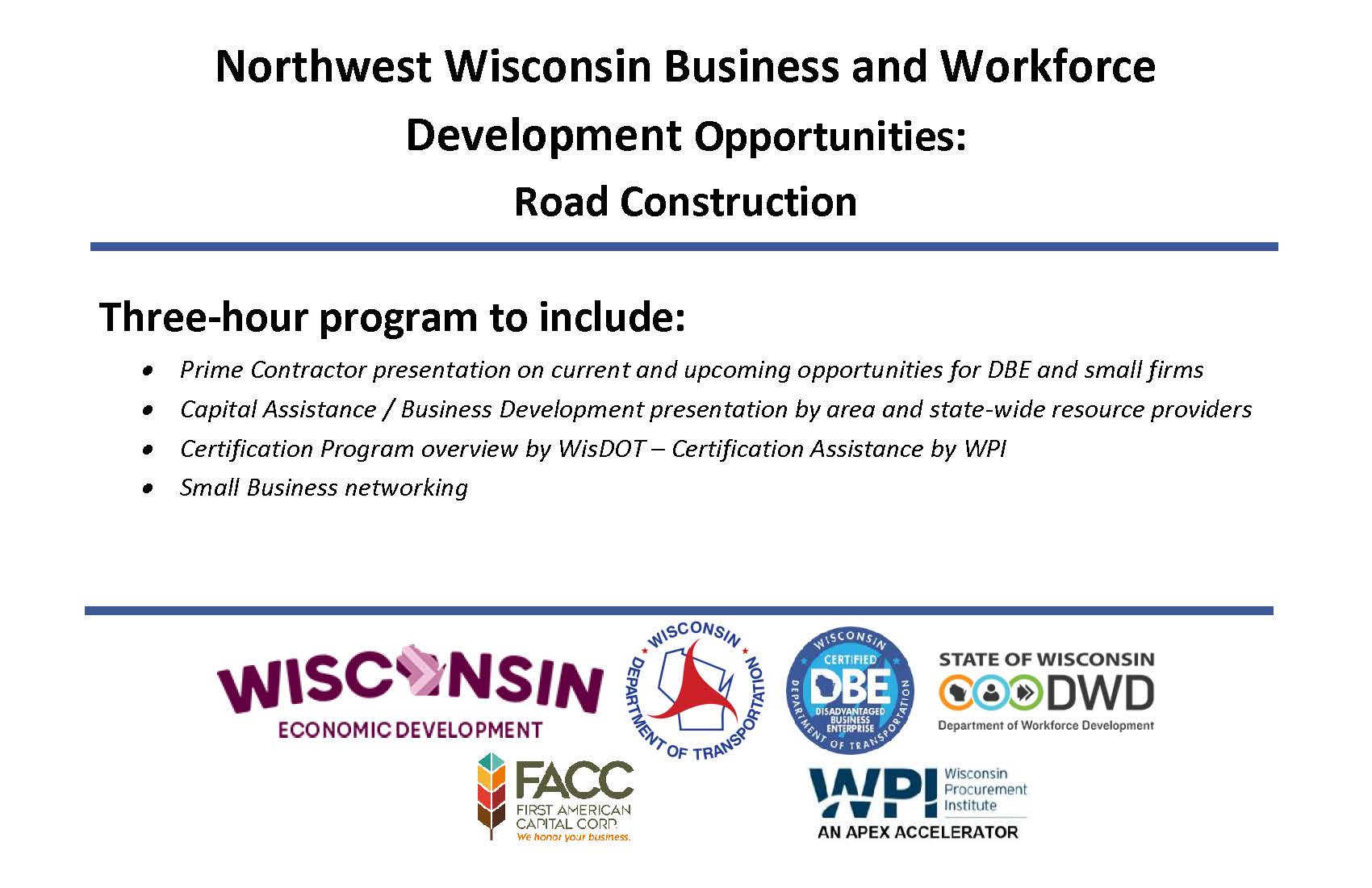 The purpose of this event is to build awareness for Northwestern Wisconsin stakeholders and communities of the contracting and workforce development opportunities available to small and DBE businesses created in road construction by upcoming highway construction projects in the NW region of the state.