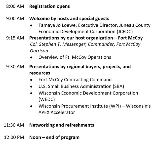 These sessions will give small and diverse businesses the opportunity to learn more about Wisconsin’s federal government facilities, meet with leadership, learn more about the installations’ operations, and about regional procurement opportunities for your business.