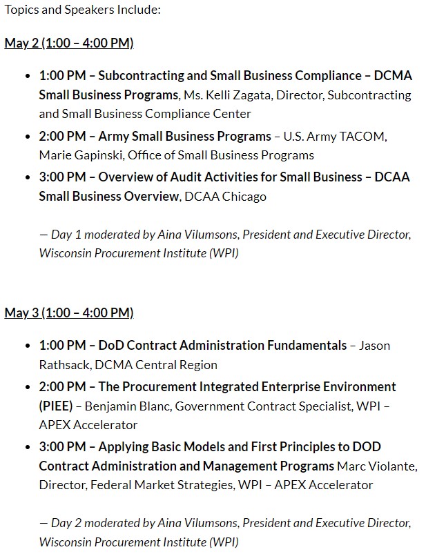 The National Contract Management Association Wisconsin Chapter along with the Wisconsin Procurement Institute (APEX ACCELERATOR) and the National Defense Industrial Association Great Lakes Chapter are hosting the 9th Annual DOD Contract Management Update on May 2 and 3, 2023. This year’s event will be presented by THE CONTRACTING ACADEMY (TCA) and will be in a virtual format.