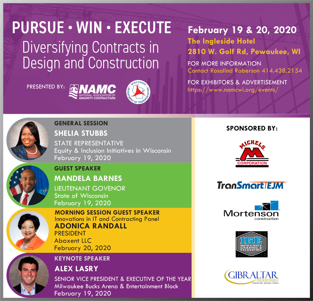 The Ingleside Hotel 2810 W. Golf Rd., Pewaukee, WI, United StatesREGISTRATION IS NOW OPEN! CLICK HERE TO REGISTER The Annual DBE Workshop and Networking Summit is the Wisconsin Department of Transportation (WisDOT) conference for small, minority, and women-owned businesses in the transportation construction industry. WisDOT is partnering with the National Association of Minority Contractors-Wisconsin Chapter (NAMC-WI), Wisconsin Transportation Builders Association (WTBA) and the American Council […]